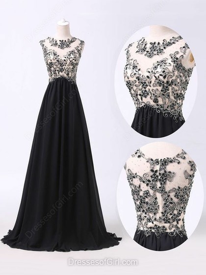 A-line Scoop Neck Chiffon Tulle Sweep Train Beading Prom Dresses na