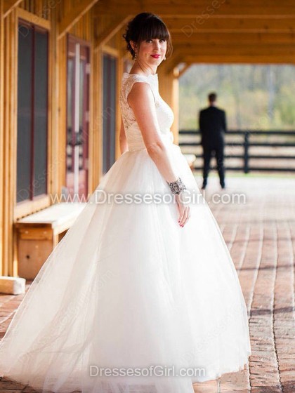 Ball Gown High Neck Lace Tulle Floor-length Flower(s) Wedding Dresses na