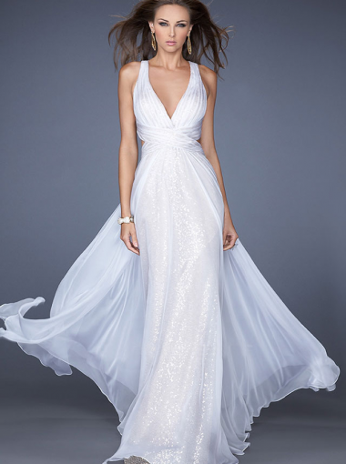 A-line V-neck Natural Floor Length Sleeveless Pleating Sequins Backless Chiffon White Prom / Homecoming / Evening Dresses By La Femme 19255 na